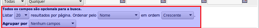 Nestas seleções é possível controlar o número de registros mostrados em cada página de resultado, e a forma de ordenamento de ser usada na pesquisa.