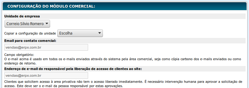 Email para o contato comercial: Endereço de e-mail que será utilizado nos contatos comerciais, orçamentos e pedidos de venda.