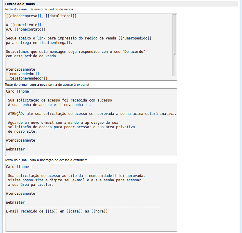Textos dos e-mails: O sistema permite o envio de mensagens de e-mail diretamente e nestas caixas podem ser configurados os textos que irão compor estas mensagens.