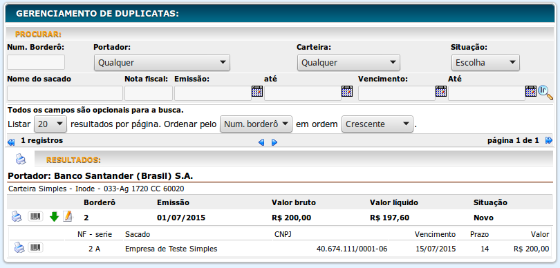 Nesta página de busca é realizado o gerenciamento dos borderôs de cobrança, a impressão de boletos bancários, a impressão de duplicatas e o download do Arquivo de Remessa para o banco.