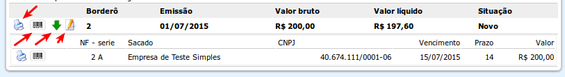 superior você poderá imprimir todos as DUPLICATAS que constam no Borderô. - Abaixo de cada borderô você vê todos os títulos que constam dele e clicando no ícone