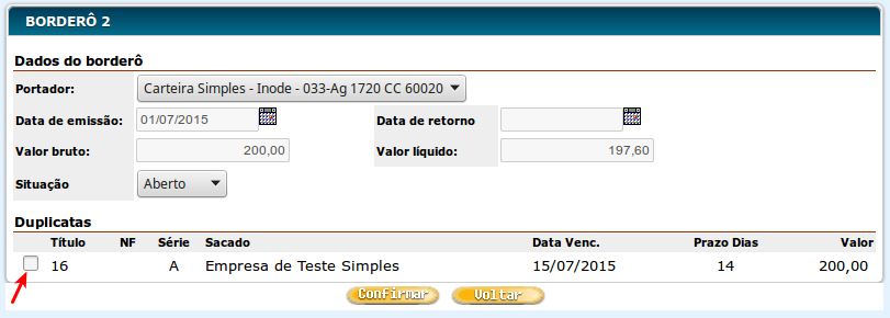 Nesta página você poderá excluir títulos do borderô e para isto basta clicar no checkbox
