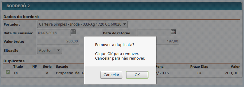 Clicando no botão OK o título será removido do borderô e clicando no botão Cancelar você cancela esta operação. Esta ação é irreversível.