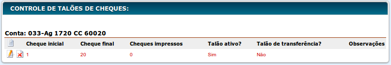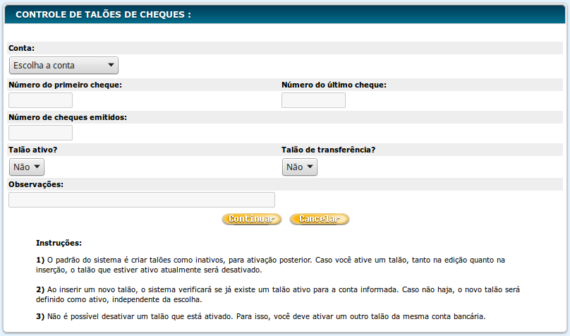 As informações que são cadastradas aqui serão utilizadas para controlar os cheques emitidos e também trazer sempre a numeração correta do próximo cheque.