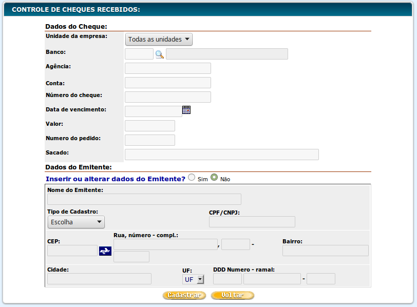 você poderá inserir um cheque recebido. Será aberta a seguinte página.