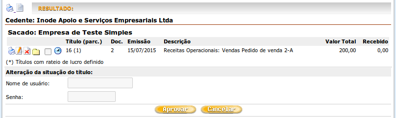 • Marque o checkbox da linha do título. Preencha com o Nome de usuário e a Senha, no final da página . Em seguida clique no botão Aprovar.