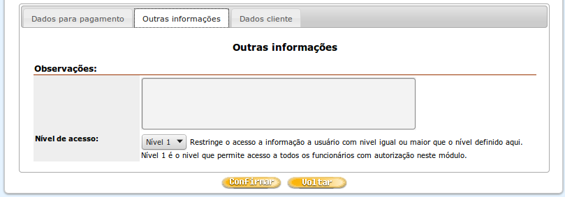 • Nível de acesso:  “Nível 1”, “Nível 2”, “Nível 3”, “Nível 4”, “Nível 5”. Restringe o acesso a esta informação a usuários com nível igual ou maior que o definido aqui.
