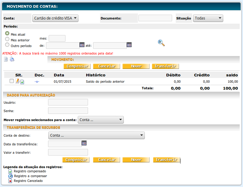 dele, escolha a conta de destino, para onde deseja transferir, e clique no botão Transferir. - Compensar: Para compensar um lançamento, marque o lançamento clicando no checkbox