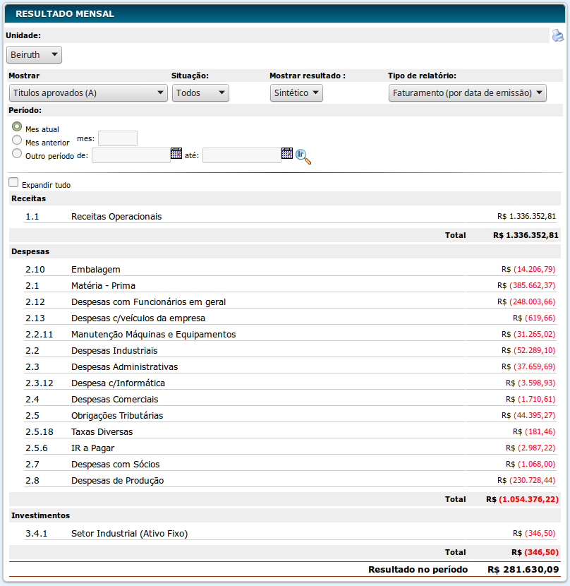 Aqui você poderá ver o Resultado Mensal da sua empresa.