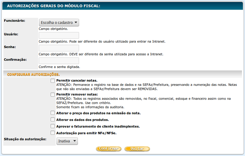 As autorizações cadastradas nesta página serão utilizadas no gerenciamento das Notas Fiscais pelo funcionário cujo nome de usuário e senha cadastrados aqui.