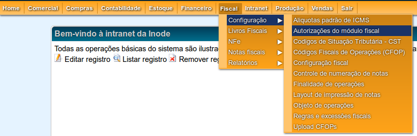 O acesso a página de Autorizações do Módulo Fiscal é feita pelo Menu Fiscal -> Configuraçao -> Autorizações do módulo Fiscal.