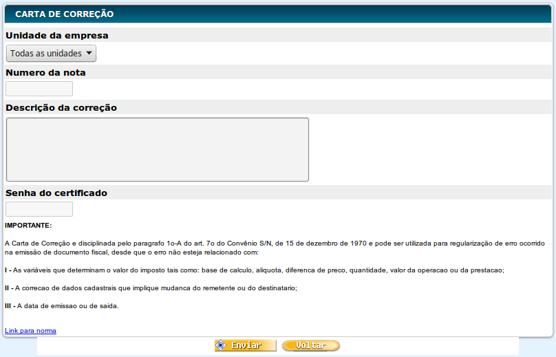 IMPORTANTE: Leia as instruções que constam da página sobre o que pode ser corrigido em uma Nota Fiscal. No final da página você poderá consultar a norma sobre Carta de Correção na SeFaz.