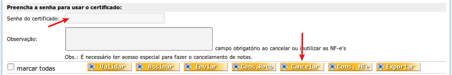 - Digite uma Observação referente ao cancelamento da NFe. Campo obrigatório.