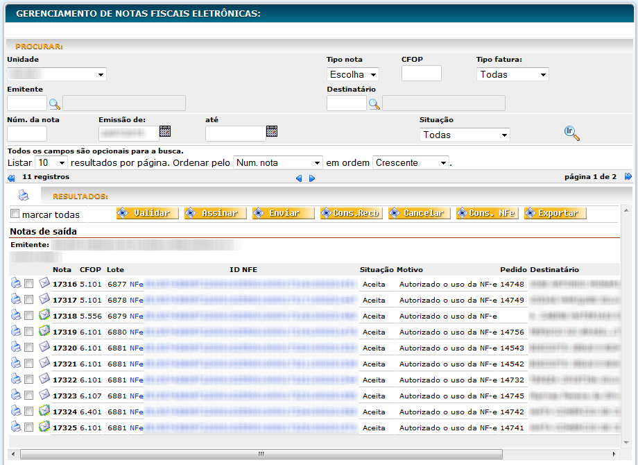 Esta página é utilizada para você enviar para a SeFaz (Secretaria da Fazenda Estadual) as Notas Fiscais que já foram emitidas pelo Gerenciamento de Notas. Depois de enviada para a SeFaz a Nota Fiscal se transformará efetivamente em NFe - Nota Fiscal Eletrônica.