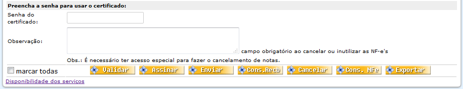 das notas que deseja enviar para a SeFaz. Você pode enviar várias notas simultaneamente, de uma única vez. - Preencha a Senha do Certificado Digital.