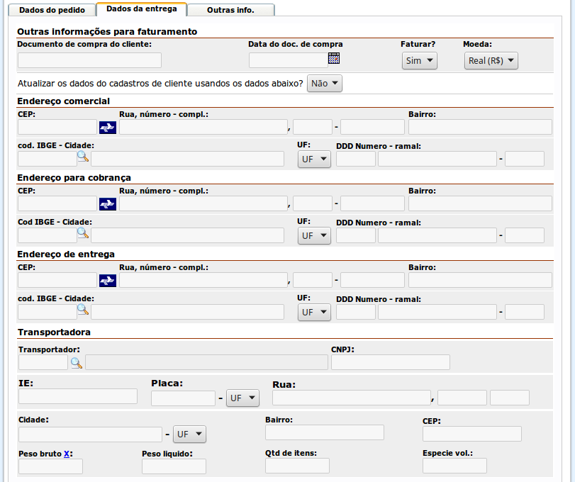 Esta aba permite que seja informada as data do pedido, data de entrega, como também o status que este pedido terá. Demais dados: Endereço de Cobrança, Endereço de entrega, Faturamento, Transportadora e Agendas de entregas, deverão ser checados e alterados conforme necessidade.