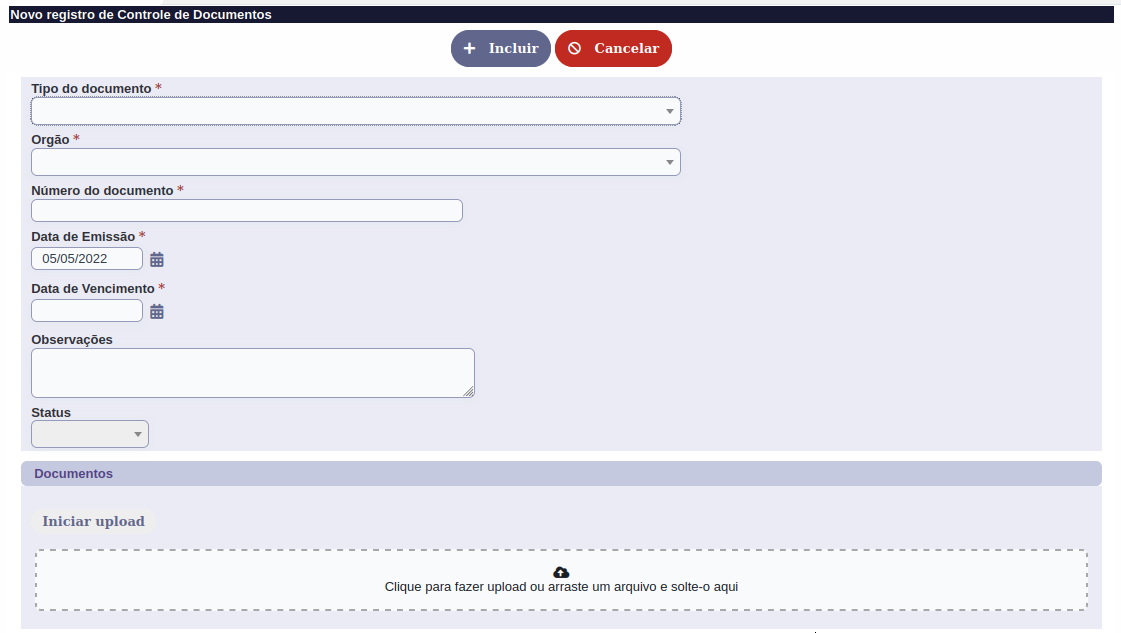 Para adicionar um novo documento clique no botão "Novo". Preencha as informações com o tipo de documento, orgão a qual esse documento pertence, N° do documento, data de emissão e vencimento.