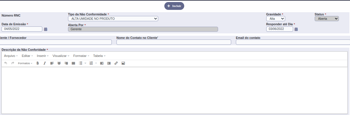 Esta página é utilizada para o cadastro de Não Conformidades.